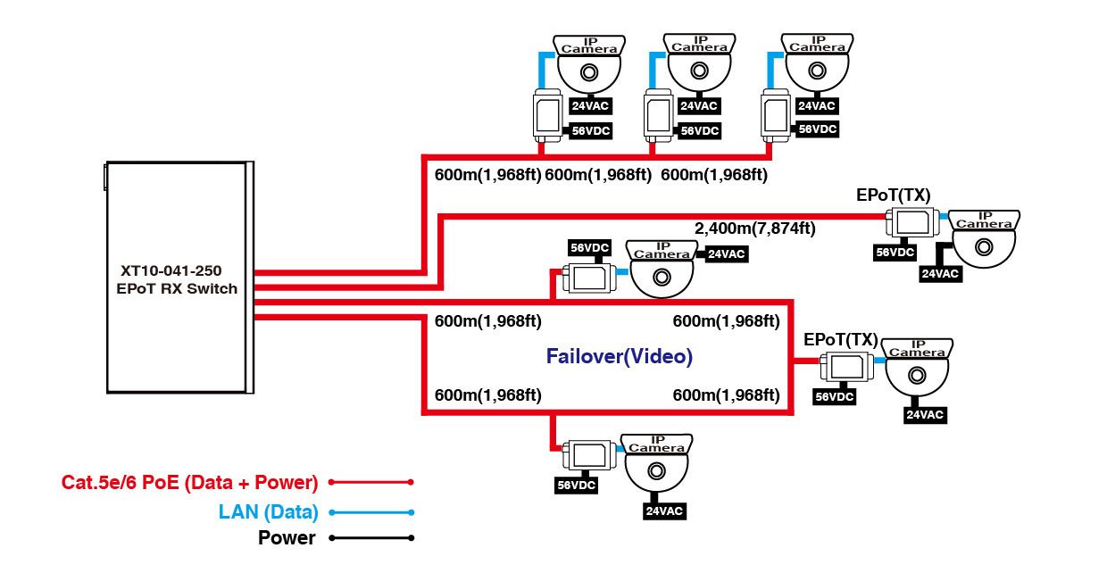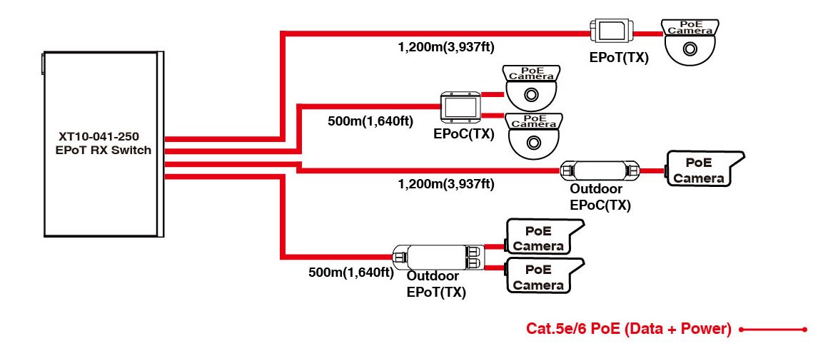 Le XT10-041-250 est un commutateur RX EPoT (Ethernet & Alimentation sur câble UTP/STP) équipé de 4 ports EPoT, 1 port Gigabit LAN et d'une alimentation interne de 250w.